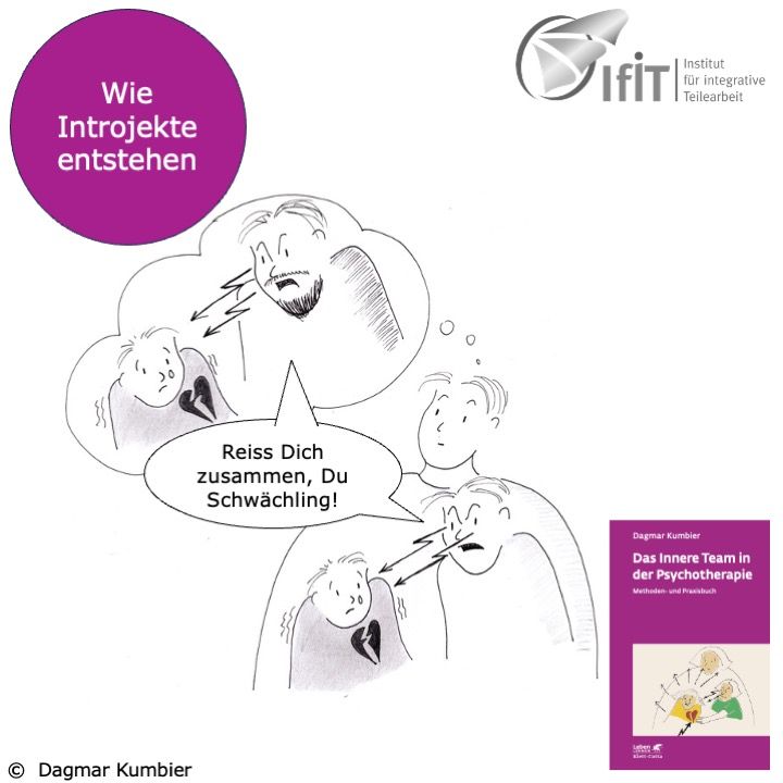 Manche inneren Anteile sprechen wie der Vater, die Mutter oder ein anderer Mensch, der prägend für uns war. Das fällt allem dann auf, wenn diese Teile ein Verhalten wiederholen, unter dem wir gelitten haben, wenn sie uns also angreifen, kritisieren, lächerlich machen. In der Psychotherapie sprechen wir von ‚Introjekten‘. Das Wort kommt aus dem Lateinischen…